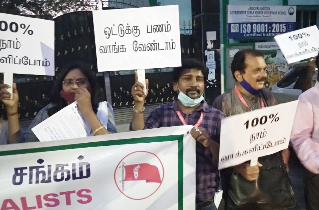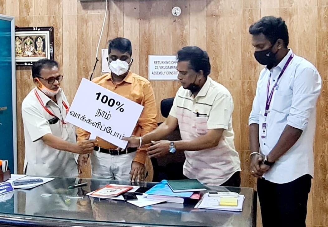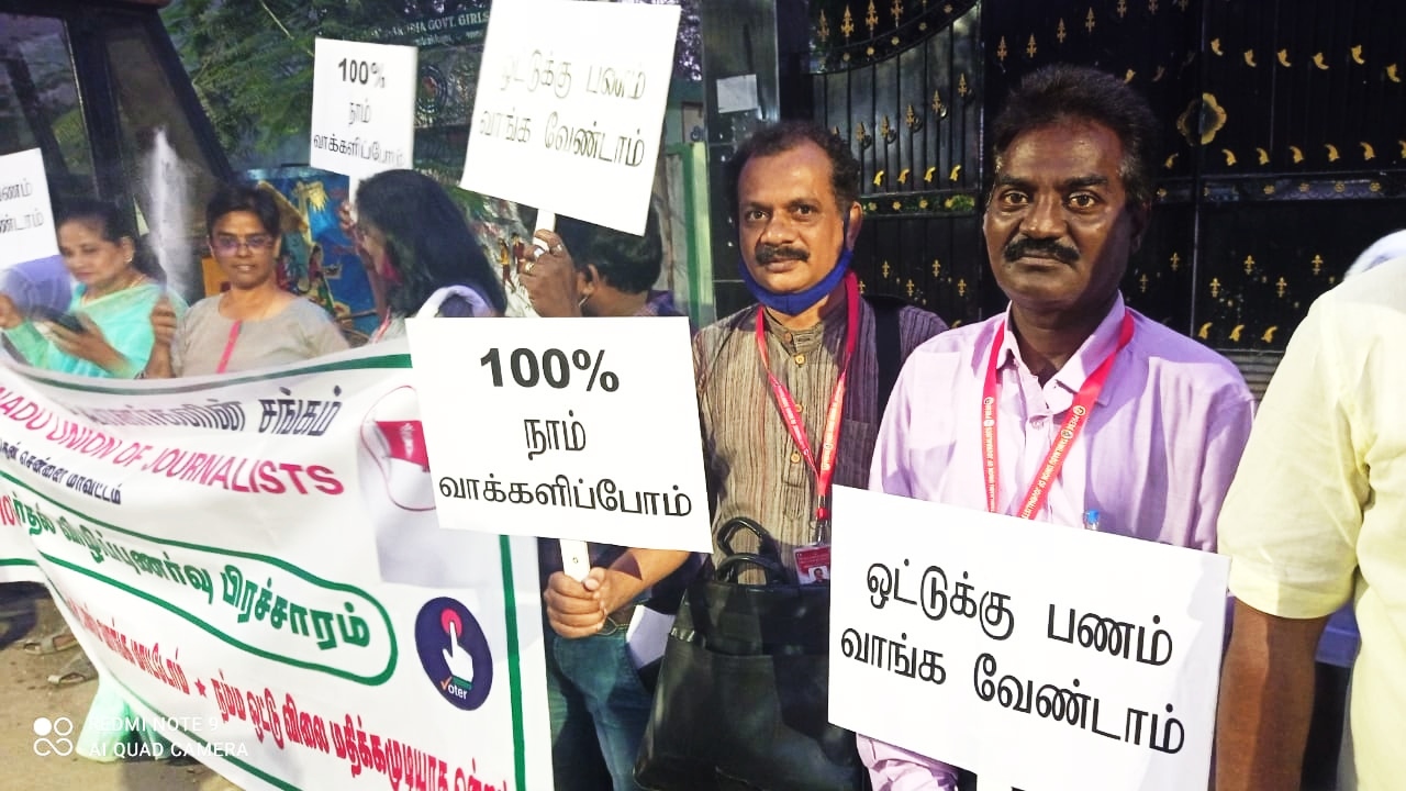 Voters should not get influenced by the political parties giving payments in the form of cash or goods, said Journalists in Chennai while organizing the awareness campaign against the cash for votes culture. The campaign was organized on March 25,2021 at Saligramam, a prime location in the Chennai city. Social workers, journalists, citizens and students participated in large numbers.